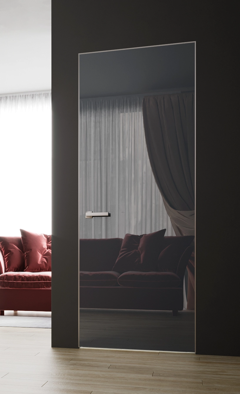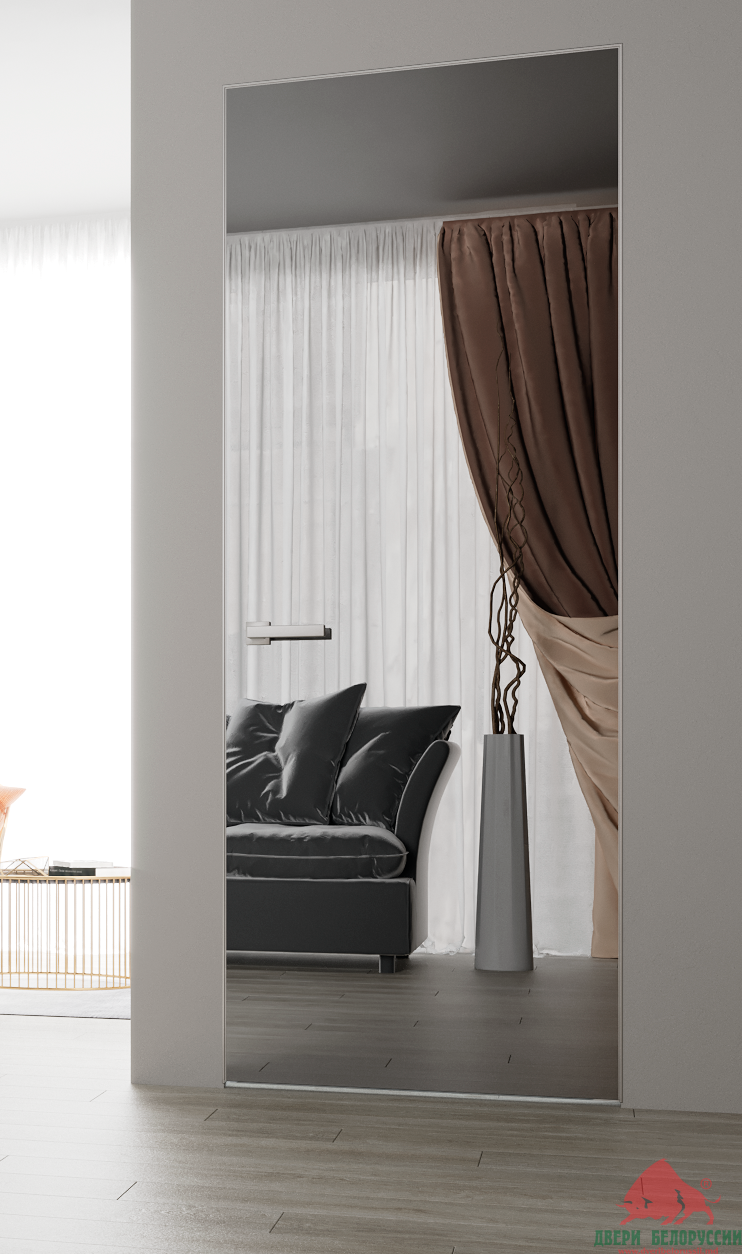 На него можно нанести различные рисунки или гравировку (пескоструй). Дверь может быть матовой или выполнена в разных цветах. Зеркала бывают матовые и глянцевые. Двери с отражающей поверхностью могут быть использованы в качестве межкомнатных, для шкафов, гардеробных, перегородок, в офисах, магазинах, кафе и т.д. Зеркальная дверь очень долго сохраняет изначальный вид и «не стареет».